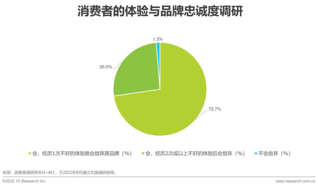 目前,中国居民的消费特点除了消费结构升级以及更追求精神消费外,还体现在对体验有不同程度的付费意愿。艾瑞调研数据显示,在包含线上及线下的商品及服务性消费场景中,均有超六成消费者愿意为了获得更好的体验而付费。其中,40%以上的人表示愿意接受<5%的溢价,17%以上的人愿意接受<10%的溢价。此外,消费者的体验与品牌忠诚度呈强关联。良好的客户体验有利于提高消费者对该品牌的喜爱度,促进购买意愿及未来的复购意愿,最终体现在用户对品牌的粘性增强、忠诚度提高。相反,据调研显示,72.7%的消费者在经历一次不好的体验后就会放弃原品牌,转而消费其他品牌。这意味着顾客全旅程的体验已成为目前品牌竞争中必不可少的要素。