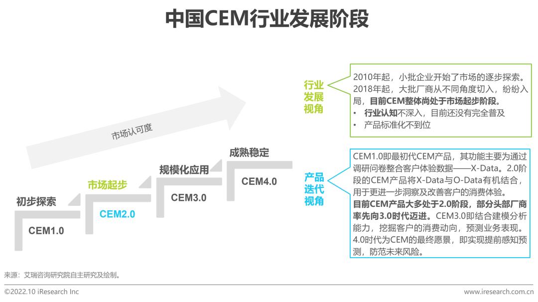 与美国相比,中国的CEM市场起步较晚。约从2010年起,国内出现了少数以问卷调研及NPS(净推荐值)项目起步的厂商,逐步开始了对CEM市场的探索。2018年底,受美国知名调查软件公司Qualtrics“以80亿美元被SAP收购”的事件影响,中国市场出现了大批从用户洞察、舆情监测和体验设计等不同角度入局的厂商,开始了CEM产品的探索及迭代;下游企业也开始对“客户体验管理”的概念有了初步认知,CEM在中国逐渐兴起。预计未来3-5年,CEM的应用将在下游各行业普及,产品迭代也将进入3.0时代。