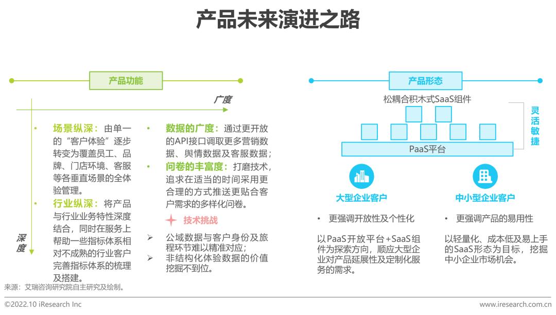 为了实现CEM产品向3.0及4.0方向的突破,未来在功能方面亟需向着横向及纵向延伸。同时,如何将公域数据及非结构化数据更好地应用在体验管理中,将是未来需要CEM厂商与外部AI厂商合力在技术方面解决的难题。在产品形态上,灵活敏捷将成为企业考量CEM产品的核心要素,在此基础上,为大型企业提供PaaS+SaaS产品以应对延展客户链路的需求,降低二次开发所需的人力、时间及资金投入;为中小企业以低代码、零代码的方式提供开箱即用的标准化SaaS产品,将成为CEM厂商未来的探索目标。