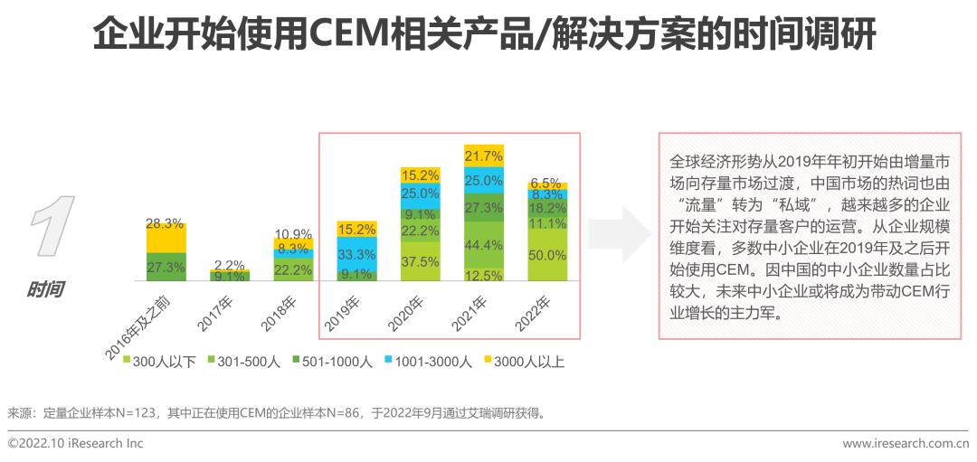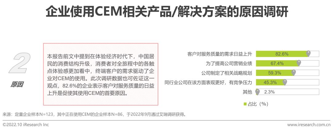 综述:多数企业于2019年后开始使用CEM;主要使用原因系客户对服务质量的需求日益上升