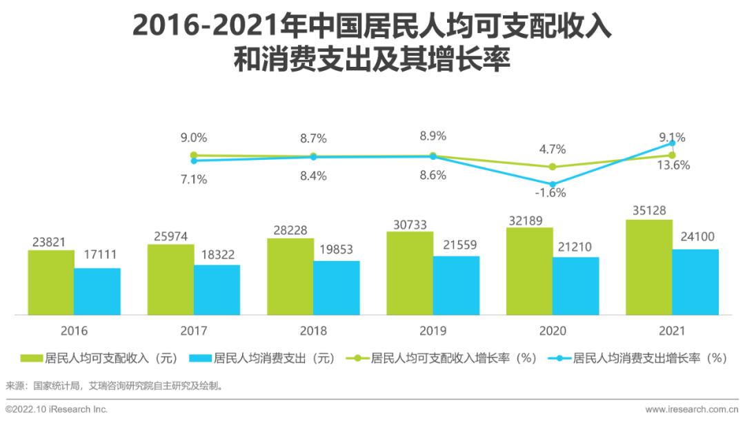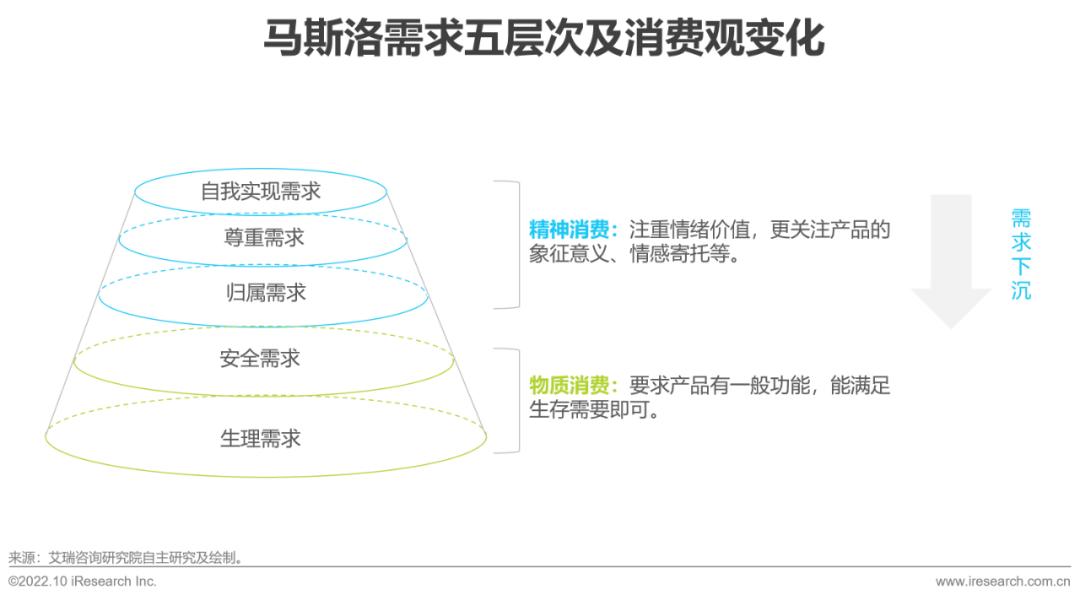 2021年,中国居民人均收入及人均消费支出分别为3.5万元和2.4万元,增长率双双恢复至疫情前水平,预计2022年及之后也将持续上升。居民人均可支配收入的增长将不断带动社会消费,使得居民购买力逐年增强。同时,随着社会意识的进步,居民的消费观念将更趋于精细化和多元化。根据马斯洛需求五层次理论,消费升级体现为上层需求被赋予更高权重,呈现下沉态势,即人们更注重象征意义和情感寄托,更青睐于高情感附加值的产品或服务,同时也预示着人们的消费理念逐步由物质消费向精神消费迈进。