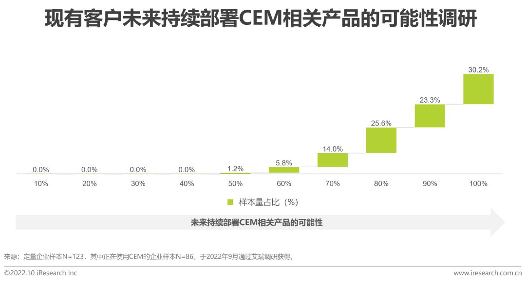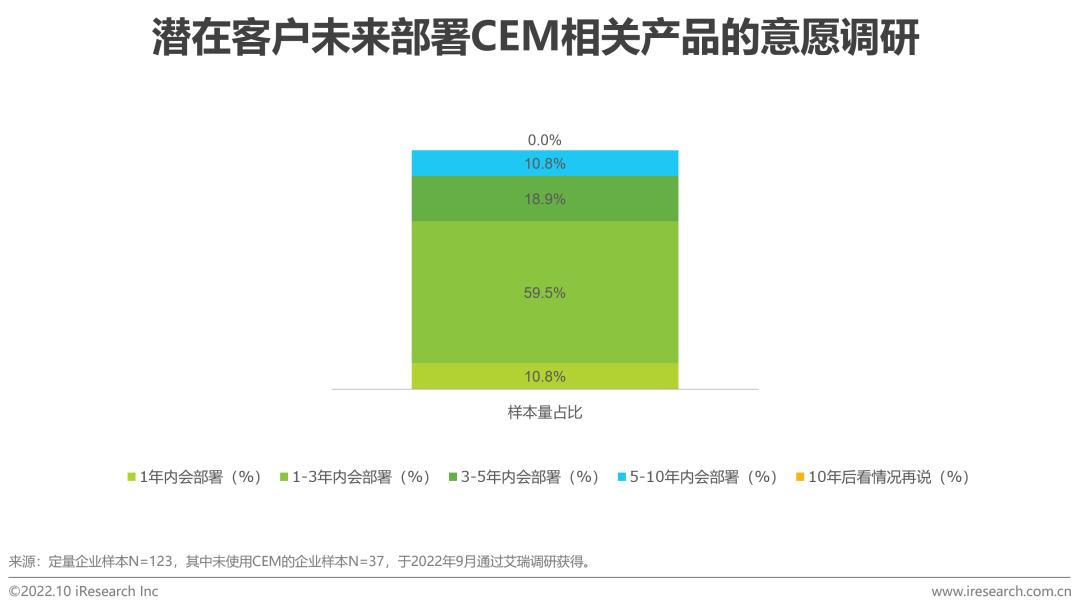 在未来宏观经济回暖的影响、企业对“体验”的日益重视以及数字化转型的浪潮推动作用下,企业对CEM相关产品的投入意愿将明显上升,旨在将营销、产品、服务和客户成功等因素综合管理,以维护长期的良性客户关系。从调研结果看,30.2%的CEM现有客户表示未来一定会持续部署CEM。对于潜在客户,10.8%的企业期望能在一年内部署CEM相关产品,近六成企业表示会在未来1-3年内部署。需求端对CEM关注度的提升将助力该行业在未来持续释放更广阔的市场空间。