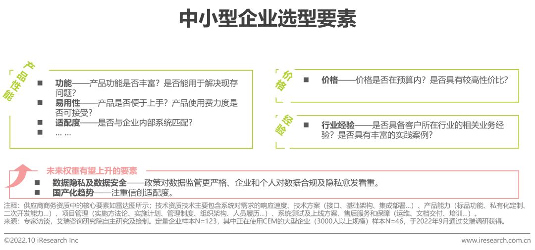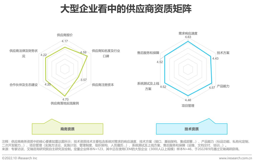 从需求角度出发,中小企业主要看中CEM产品性能(包括功能、易用性及适配度等方面)、价格及供应商在该行业的经验积累和实践案例。大型企业通常依靠完整的招标流程,在采购产品时会对供应商的商业及技术资质做出综合评判。艾瑞调研结果显示,在下图所示的商务资质中,大型企业更看重供应商的实践案例,其次为知名度及行业口碑;在技术资质方面,大型企业更看重需求响应速度,产品能力(标品功能、私有化定制和二次开发能力等)次之。未来,受到国产化风潮的推动及数据监管日益严格的影响,尤其对大型企业/国企来说,信创适配、等保或将成为供应商竞争要素中的关键。