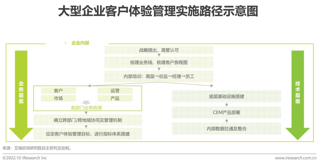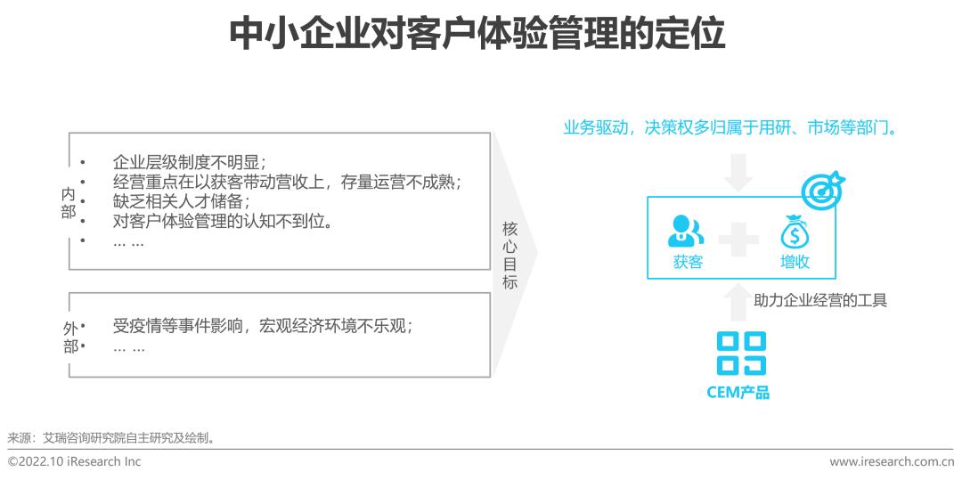 大型企业在实施CEM的过程中牵扯到众多部门及业务流程,更多地将客户体验管理视为集团的重大战略转型目标,会利用数据进行内部管理考核,将其视为部门及公司管理的指标工具。因此,大型企业实施CEM多为CEO等企业高层的“一把手工程”,之后再自上而下,业务与技术层面双管齐下,促进部门协作及数据拉通。反之,由于企业管理的相对扁平化特点,以及人才储备不到位、存量运营不成熟等痛点,加之疫情等“黑天鹅事件”对宏观经济造成一定负面影响等原因,多数中小企业不会将CEM视为现阶段的刚需,他们更在意利用数据洞察出问题后,相关协同部门能否更好地解决问题。因此中小企业在较大程度上会将CEM视为一个辅助经营类的工具,希望将客户满意度NPS等指标与最终业务成交数据或ROI相关联,以期快速改善自身经营状况。