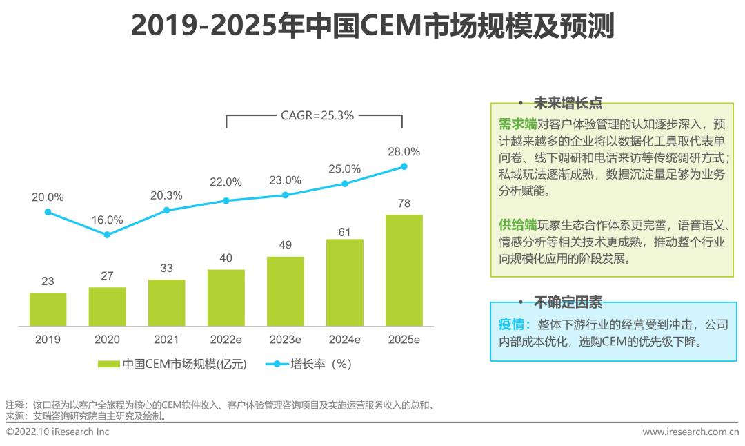 据艾瑞测算,2021年中国CEM市场规模达33亿元,较2020年增长20.3%。随着需求端对“体验制胜”意识的觉醒和私域玩法的经验沉淀,以及供应商产品的成熟和生态体系的完备,中国CEM行业预计将在未来3-5年步入发展快车道,释放市场活力。