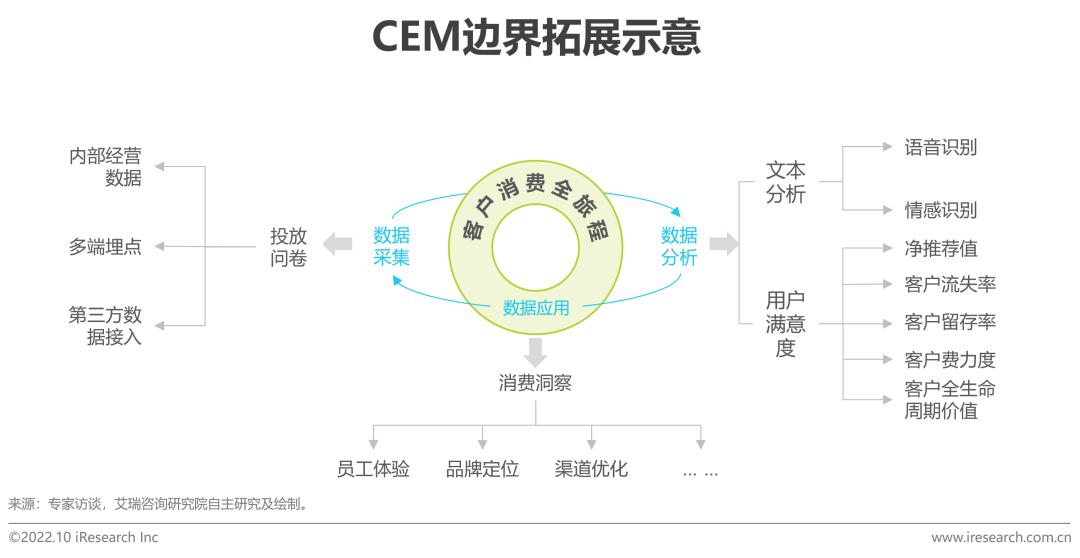 CEM在国内处于发展初期,各厂商在快速进行产品迭代,不断探索在CEM领域的新玩法。就使用范围及边界来看,CEM以客户全旅程为中心,以客户数据的采集、分析及应用为主要功能,其边界在不断外拓。① 数据采集:早期主要以投放问卷为主要数据来源,如今向着多触点、多埋点的方向探索,力求CEM与内部业务系统(如CRM、营销系统、客服系统等)及外部舆情等多元数据打通。② 数据分析:在技术方面从依靠文本分析逐步探索更多AI技术的应用,如语音识别以提取客服对话信息,情感识别以细化情绪数据标签等。在度量指标方面也在由原先单一的用户满意度(CSAT)逐步发展为净推荐值(NPS)、客户费力度(CES)等多种指标进行多维度交叉分析。③ 数据应用:不断拓展应用场景,对员工体验、品牌定位以及ToB场景中的渠道优化等全方位赋能。