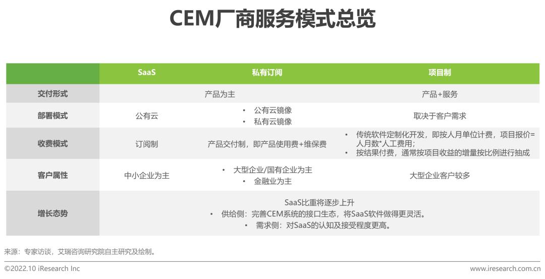 CEM服务商的交付形式总体上可分为两种:产品为主和产品+服务。在以产品为主的交付形式中,因无需考虑基建、运维等费用,成本相对较低且交付周期较短,中小型企业客户更倾向于使用SaaS软件;相对而言,大型企业和国有企业更注重数据的安全性及数据的自主掌控权,因此更倾向于产品私有化部署。