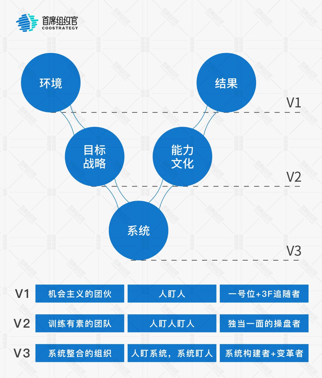 第三阶段,进入到半决赛、决赛,组织能力的载体就不能仅是团队了,需要发展为“系统整合的组织”。这个时候管理上沿用“人盯人盯人”的方式已经不够用了,此时需要“系统构建者和变革者”去制定可以管理更多人的系统,用“人盯系统,系统盯人”的方式提高管理效率。