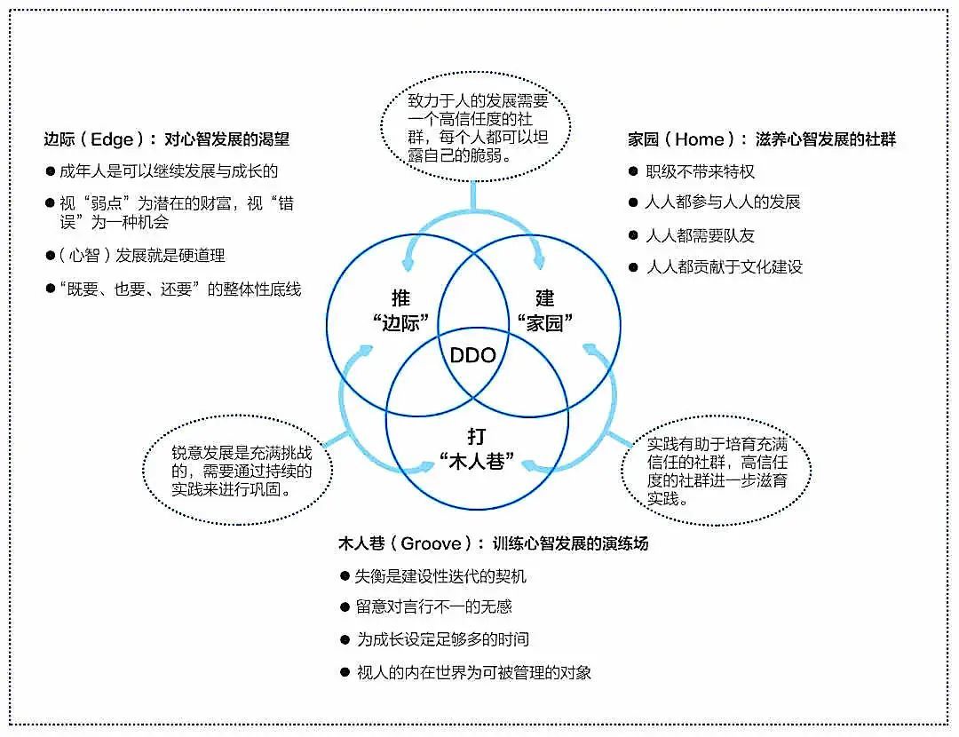 我喜欢DDO(Deliberately Developmental Organization)锐意发展型组织的原因是因为它没有那么大的束缚性。比如当我们谈青色组织的时候,我们提出很多疑问,但是当我们谈DDO的时候,就会发现DDO作为一个组织的样貌可以发生在任何不同的层次的组织里面。比如说我们可以在华为、阿里看到DDO,我们可以在不同的国外的企业里面看到DDO,当然我们更多希望是这个DDO能够呈现青色组织的样态。