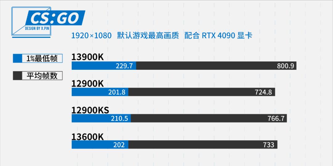 老牌竞技游戏 CS:GO,可以说是 CPU 跑分的有效试金石了,在人均 700 fps 的情况下,13900K 的平均帧一口气冲上了 800,放眼望去确实很难找到对手。