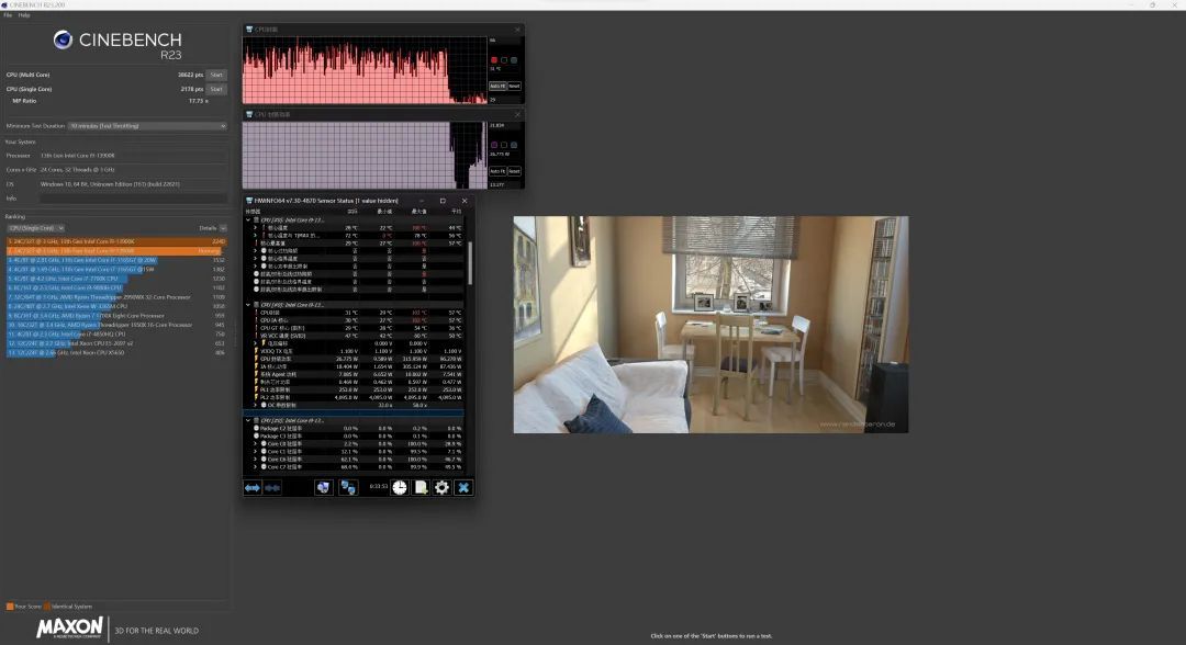 首先是常规的 10 分钟循环测试,13900K 的多核成绩达到了变态的 38622 ,和十二代 i9 拉开了一万多分的差距。