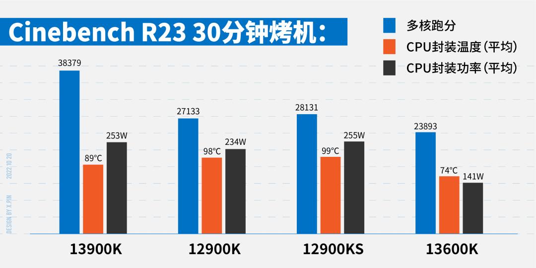 而在三十分钟烤机测试中,13900 用了和 12900KS 几乎差不多的封装功率,甚至温度还低了十度,依然达到了 3W8+ 的分数。