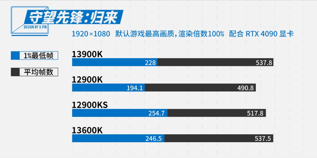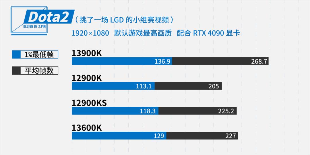 守望 2 的帧率对比的结果,和 DOTA 2 的结论类似,13600K 的跑分在守望 2 里甚至还要再过分一些,有点和 13900K 平起平坐的意思了。