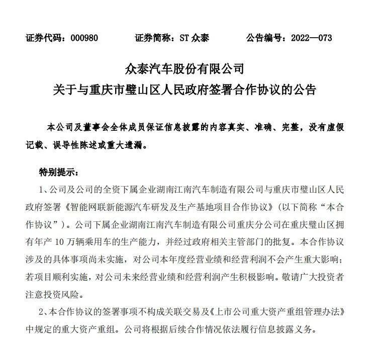 今年8月,ST众泰与重庆市璧山区人民政府签署《智能网联新能源汽车研发及生产基地项目合作协议》,双方将在智能网联新能源汽车项目开发建设领域构建深度合作关系。ST众泰将在璧山建立智能网联新能源汽车研发及生产基地项目,改造并建成年产10万辆新能源整车生产基地。