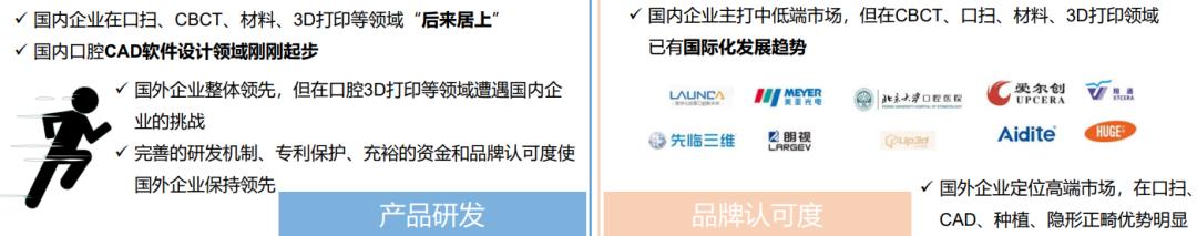 尽管国内众多玩家入局,且已有国际化发展趋势,但《2020中国口腔产业数字化趋势调研报告》指出,国内企业在3D打印等领域主打中低端,国外企业定位高端,在口扫、CAD、种植、隐形正畸领域优势明显。