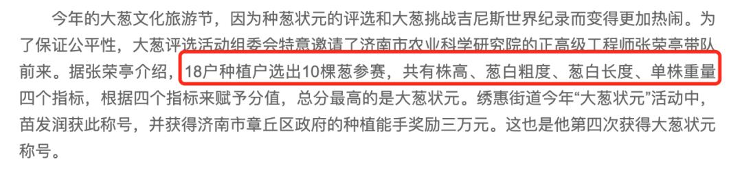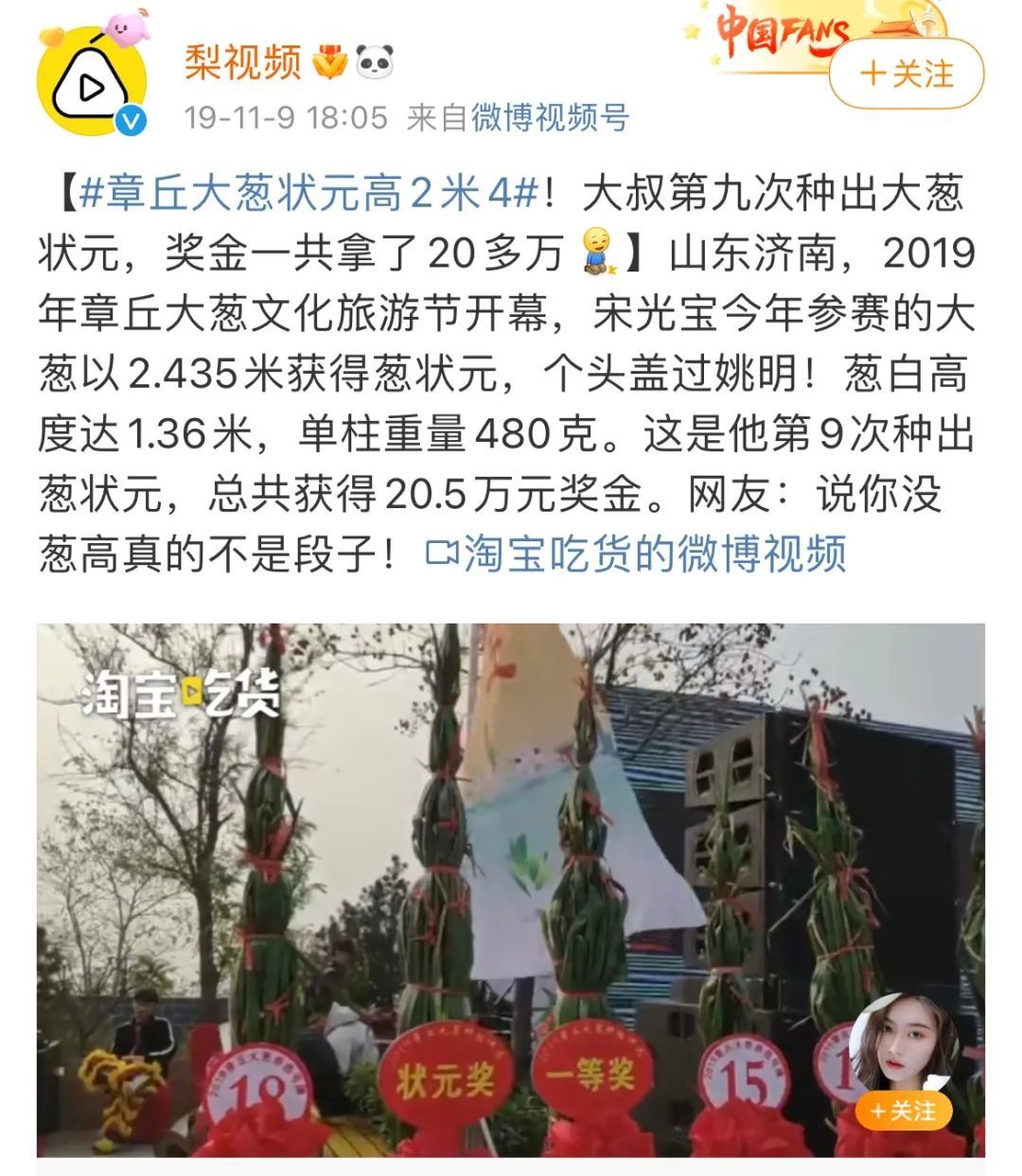到了2019年,“葱状元”已经变成了2.435米——精确到小数点后三位的计数方式,也展现了山东人对大葱的重视。