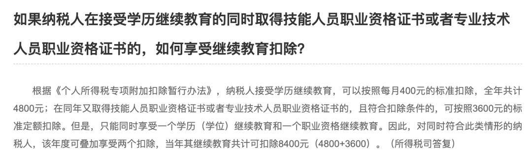而一本证书带来的收益,远远不止这些。拥有一些特定的资格证书,往往还能解锁一些隐藏福利。例如在考证的当年,便可以按照学历继续教育的名义,在个人所得税汇算中享受所得额的专项扣除。