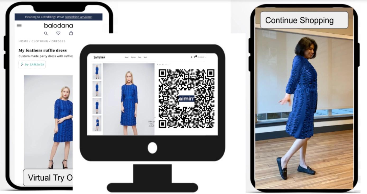 据Kanani介绍,他在结婚时萌生了创业的想法,因为他的祖母想把自己用过的婚纱传给他的未婚妻,但随后爆发的疫情让物流中断,远在印度的祖母无法把婚纱寄给他在美国的未婚妻。因此,Kanani决定利用他在计算机视觉和图形行业的专业知识以及长达七年的视觉视频创作工具研发经验,创建这款名为「AIMIRR」的虚拟试衣间技术。通过芝加哥大学的Polsky加速器,他逐渐将这个想法打磨成熟,并利用该项目提供的12万美元启动资金进行技术开发。