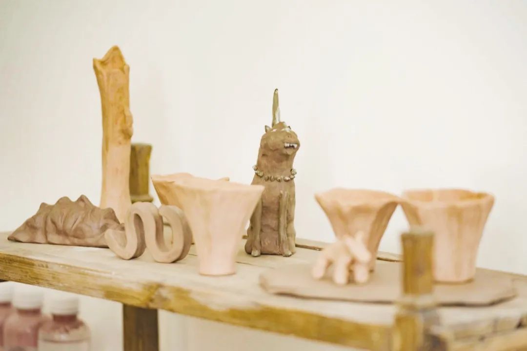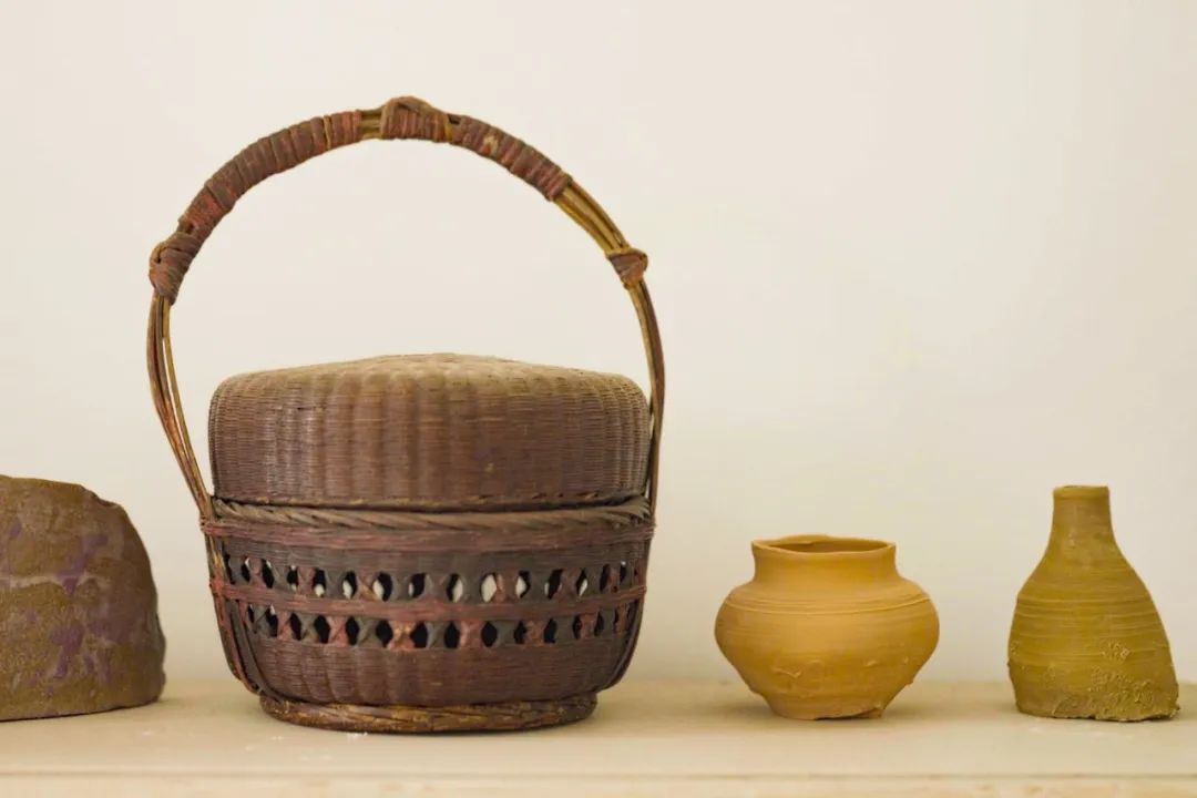 Peter的空间原本只是一个隔断的位置,是最小的一间,倒是被他塞下了各种稀奇的玩意儿。他爱有古老气息的物件,搜罗了许多,有清末民初的手编竹篮,也有八十年代产的哥斯拉摆件。他自己的陶艺作品也陈列在一起,手工的痕迹和那些物件相得益彰。