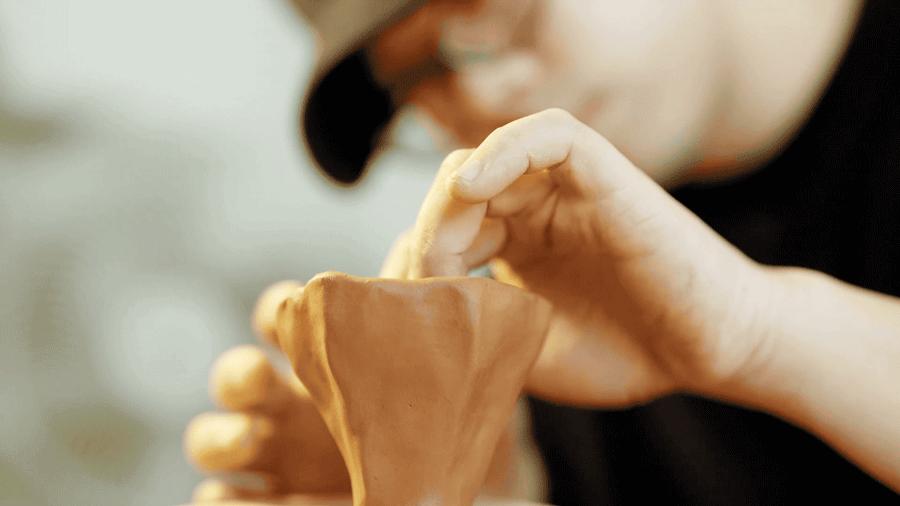 ▲ 做陶中的Peter和他的作品、收藏的老物件