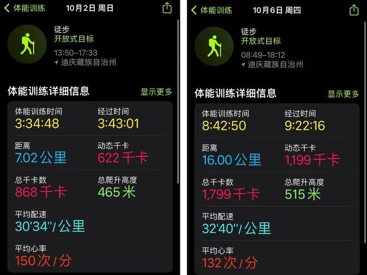 徒步进行中我会根据这两数据来调整步幅节奏。结束后相关的爬升、阶段心率也会当作今日徒步难度的一项参考值,再由此来决定明天要继续冲,还是慢慢来。