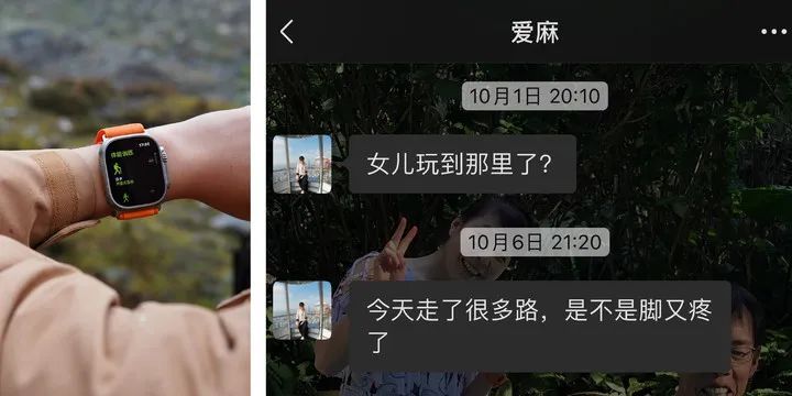 就像我在山中某刻有信号时,手腕上 Apple Watch Ultra 收到了爸爸发来的信息: