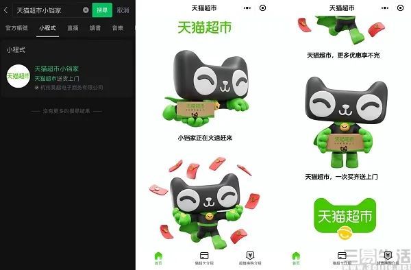同样“雷声大雨点小”的,还有日前被曝光的由天猫超市推出的微信小程序。据相关消息显示,天猫在微信上线了一款名为“天猫超市小铛家”的小程序,并配有天猫超市的logo与“天猫超市送货上门”的介绍。