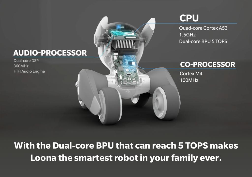 Loona 配置了相当强的硬件,它搭载了Cortex A53 的 CPU 和 Cortex M4 的协处理器、以及双核 DSP 音频处理器,所以Loona总是能够做出快速反应。通过3D-ToF 摄像头等感知元件和算法加持,Loona可以执行人脸识别、身体检测、手势识别、3D动作捕捉、物体识别、情感感知、标志识别等感知功能。