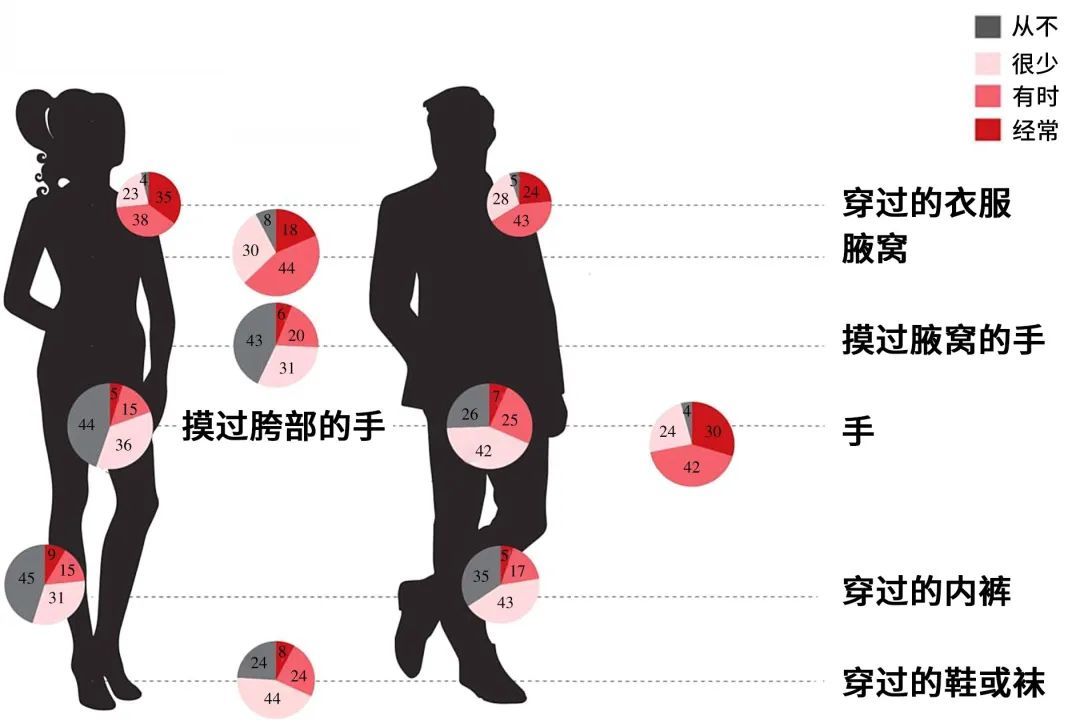除了直接闻自己,从穿过的衣物上闻气味的参与者也很多,比例从高到低依次是上衣95%~96%、袜子或鞋76%、内裤55%~65%。