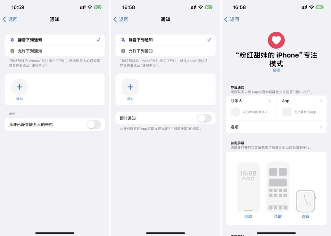 但是到了这一步就需要注意,需要在「静音通知」的选项下分别点击联系人和 App 选项,在对应的设定页中均选择「静音下列通知」并保持下面的选择区域留空。这样,我们就相当于创建了一个通知完全无限制的专注模式。