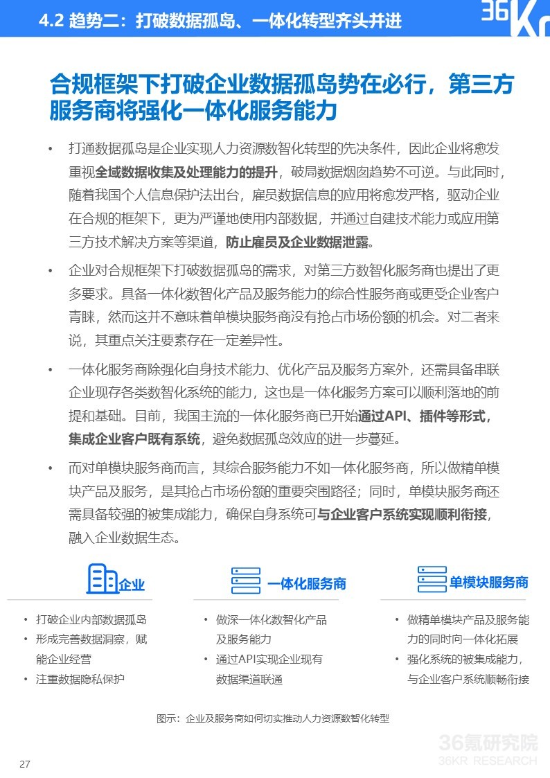 在我国人力资源数智化转型过程中,数字化工具及平台布局有限、系统与系统间数据孤岛问题亟待解决,构成我国企业数智化转型的桎梏。越来越多的企业及第三方服务商也意识到这一点,试图从多维度破局数智化转型难题。就企业自身而言,数智化意识的持续觉醒推动企业自上而下树立数智化思维,从雇员个人成长、员工关怀、舒适化办公体验、平等薪酬福利机制等层面引导企业数智化管理及办公环境的打造,实现数智化工具“物尽其用”。从第三方服务商角度而言,打通数据烟囱、以数据安全为核心打造一体化、全链路的数智化解决方案已成为其抢占竞争高地的必要条件,也是其打磨技术能力的重点方向。企业内部数智化意识强化与第三方服务商的技术赋能,有望带来人力资源数智化转型的持续深入,从数字化走向智能化,释放更大的应用价值。