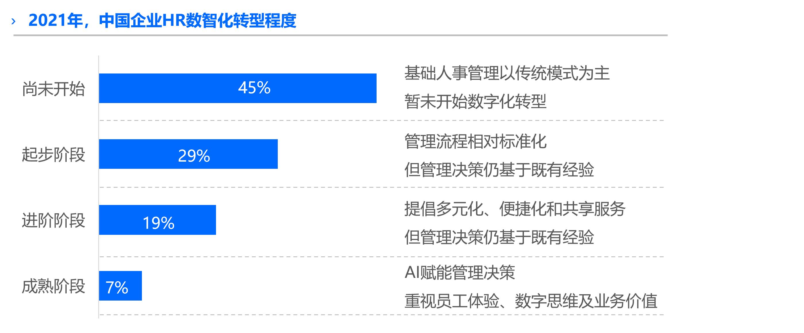 2021年,近半企业尚未开启HR数智化转型尝试,人事管理依赖传统模式;剩余企业中,尽管48%已实现数字化管理工具的应用,但管理决策仍旧以既往经验为主,缺乏智能化布局,仅有7%企业将数字化工具和智能化决策结合,并由此赋能员工体验、数字思维及业务价值。