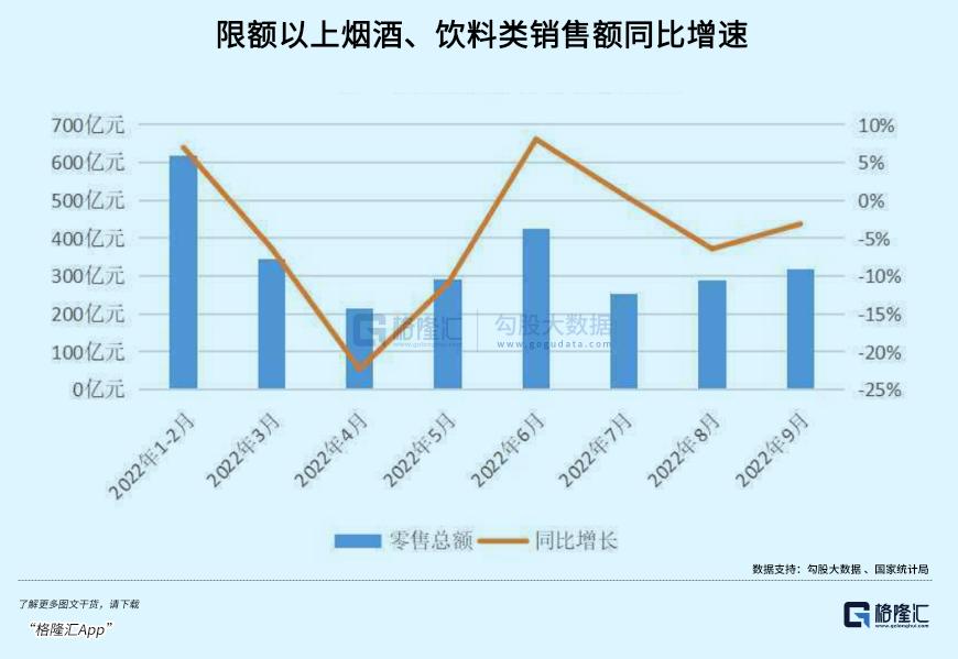 细分看烟酒类,9月销售额为465亿元,同比大幅下滑8.8%,是社零消费跌幅最大的细分领域。而今年8月,烟酒类同比增速为+8%。