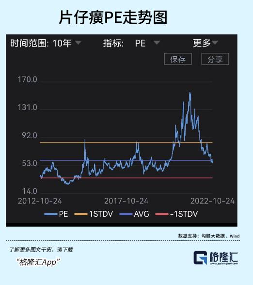 整体而言,片仔癀三季度的业绩表现是不及市场预期的,也是今日股价大跌的重要逻辑。不过,片仔癀没有集采风险,且产品具备较强的消费品属性,底层逻辑没有被动摇。目前,跟茅台一样,也在还过去估值泡沫的债。去年6月,PE最高去到150倍,现在还有56.5倍,仍然处于最近10年估值中线水平,并不低估。