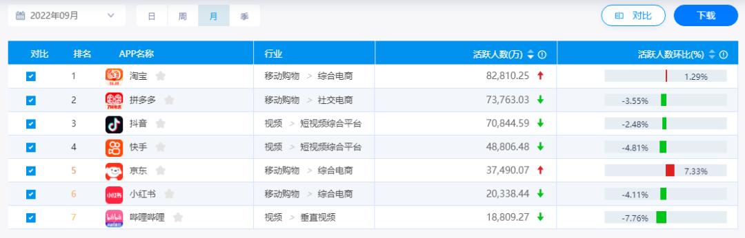易观千帆数据显示,以传统电商平台起家、近年不断发力电商直播的淘宝、京东,9月的月活分别达到8.28亿、3.75亿;靠短视频、直播两手抓发展起内容电商的选手抖音、快手,9月的月活分别为7.08亿、4.88亿;即便是与B站一样在电商领域目前都处于摸索状态的小红书,9月的月活也达到2.03亿。