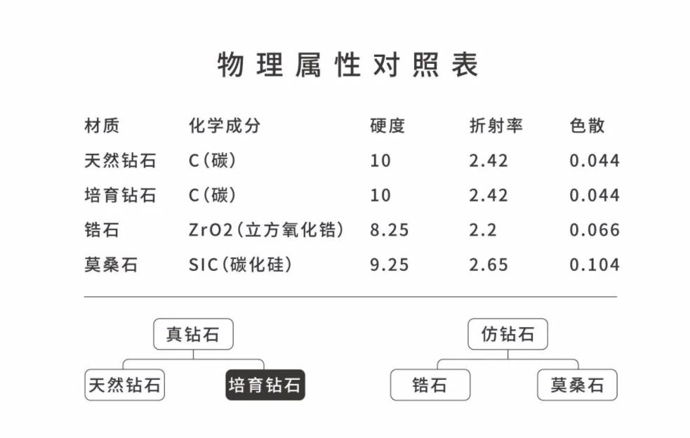 值得注意的是,培育钻石也是真钻,物理化学性质与天然钻石一致。在化学成分上,培育钻石和天然钻石都是由碳原子构成;物理性质上,培育钻石硬度、折射率、色散值等核心指标与天然钻石相同,而与锆石、莫桑石等常用的钻石替代物有本质区别。锆石的主要成分是硅酸锆,莫桑石的主要成分则是碳化硅。