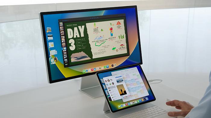 其三则是iPad OS 16的新功能,即连接显示器之后,iPad和外接显示器可以一起显示多个App,文件和App也能在两块屏幕间来回拖放,进入类似电脑的办公状态,而外置显示器最高支持6K的分辨率。