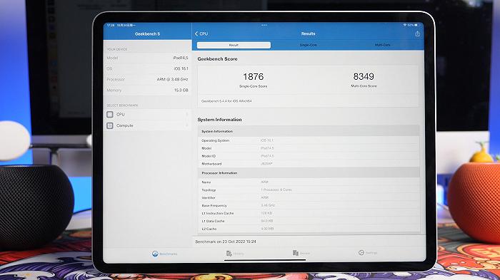 根据测试软件来看,新款iPad Pro的单核跑分为1876,多核则是8349。这样的成绩甚至超过了部分笔记本电脑,相当夸张。