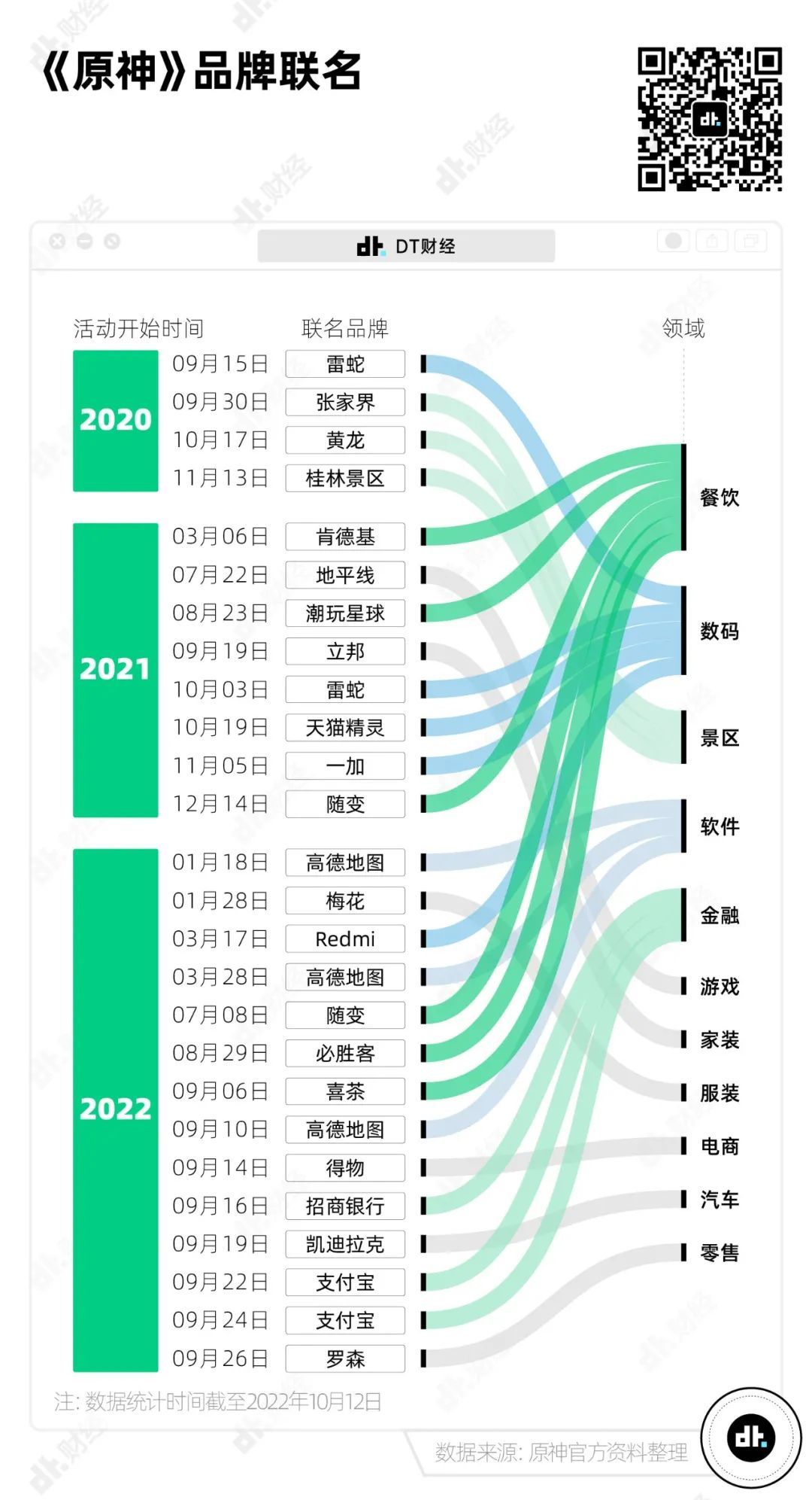 据统计,仅2022年1月-9月,《原神》就进行了至少14场品牌联名,涉及餐饮、零售、金融等各类品牌。
