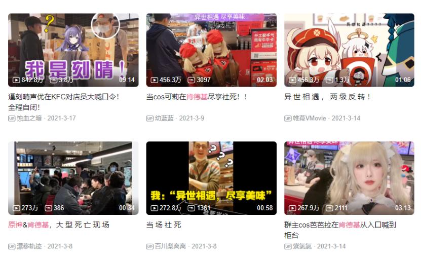活动开启后,玩家纷纷涌入肯德基小程序订购,场面堪比双十一抢购,套餐迅速售罄。与此同时,部分玩家将到店对暗号购买套餐的视频上传B站,获得了上百万的播放量。微博话题 #原神肯德基 也登上热搜,阅读量上亿。