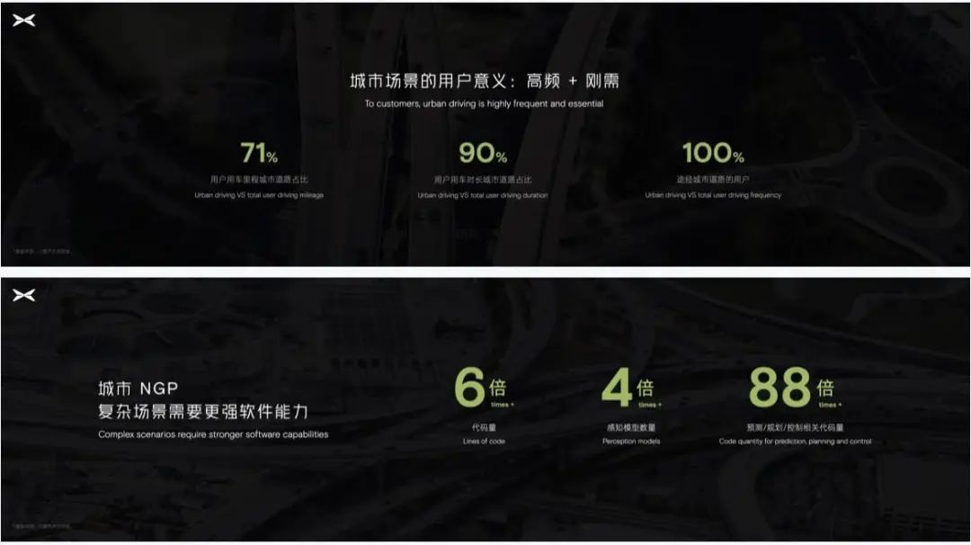 但是城市道路不仅是用户的高频场景,更是刚需场景。发布会上吴新宇博士展示了几组数据,在用户的总用车里程中,城市道路占比高达 71%,换成用车时长维度则可以占到90%。同时,每天仅有25%的用户出行会通过高速,而城市道路则是100%。