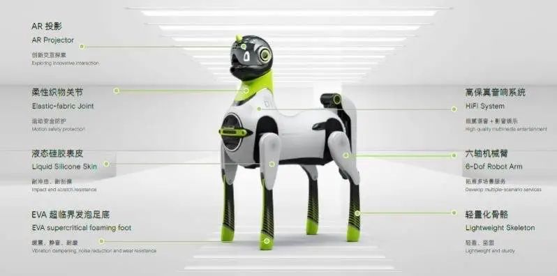 从配置上看,颈部和肩部使用了柔性织物关节、液态硅胶表皮,足底使用EVA超临界发泡足底,除此之外还有高保真音响系统、六轴机械臂、轻量化骨骼。