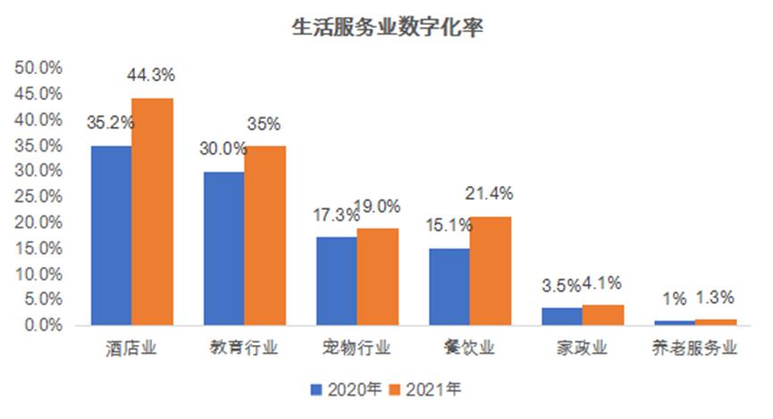 《中国生活服务业数字化报告(2022)》显示,数字化正在成为服务流程标准化的利器,然而生活服务业内部各行业的数字化水平差异比较大。例如酒店业的数字化率达到44.3%,餐饮业数字化率大概是21.4%,家政业数字化率是4.1%,养老服务业的数字化率仅为1.3%。