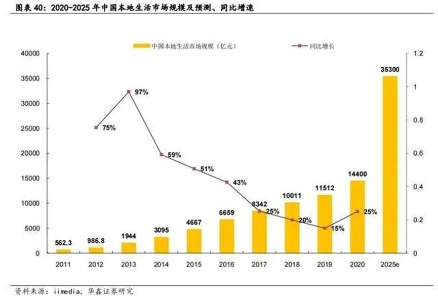 数据显示,2020年中国本地生活服务市场规模为19.5万亿元,到2025年有望增长至35.3万亿元,而当前本地生活整体线上渗透率仅为12.7%,提升空间广阔。