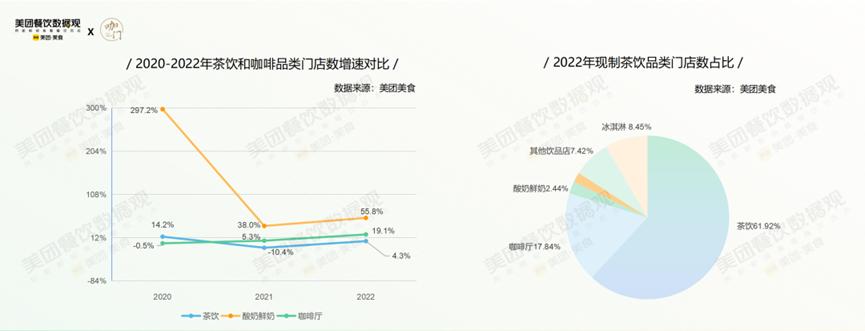 据不完全统计,目前国内有163个新式茶饮品牌,咖啡品牌也在持续增长。其中现制茶饮增速最快,到2025年预计会达到3400亿,复合年均增长率25.5%;今年,咖啡赛道的门店数增速也高达19.1%。