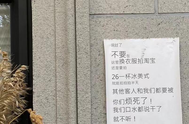 不过,也有不少商家对此感到不满,尤其是当许多人趁着“打卡文化”进行商拍后,已经有不少地区的商家在咖啡馆外贴上各种告示,提醒“不要在这里换衣服商拍,26一杯冰美式,就能拍拍拍半天,其他客人和我们都要被你们烦死了”……