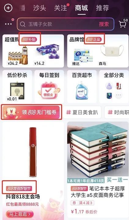 818好物节期间,可以看到商城页面都是与活动相关的优惠信息:818补贴、818正品、领818无门槛券...