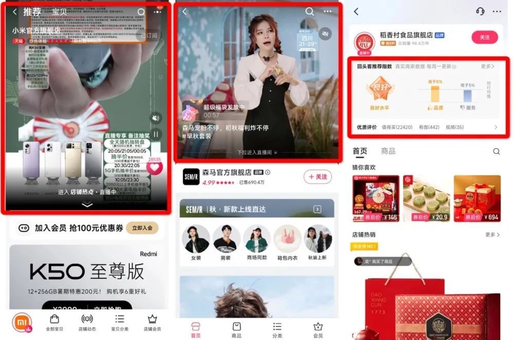 单品、店铺、商城,这是电商货架的纵向结构。商城之下,店铺基于平台各自的特色,也有差异化的设计:主打“信任”的快手,品牌旗舰店首屏的上半部分,着重强调“回头客推荐指数”;抖音的品牌旗舰店,直播间入口占据了首页半屏的空间,这和淘宝的“店铺二楼”版块比较接近;而淘宝,店铺主页设置有直播、商品、会员、动态、分类这五大区块,业态更均衡、精细。下图左淘宝、中抖音、右快手: