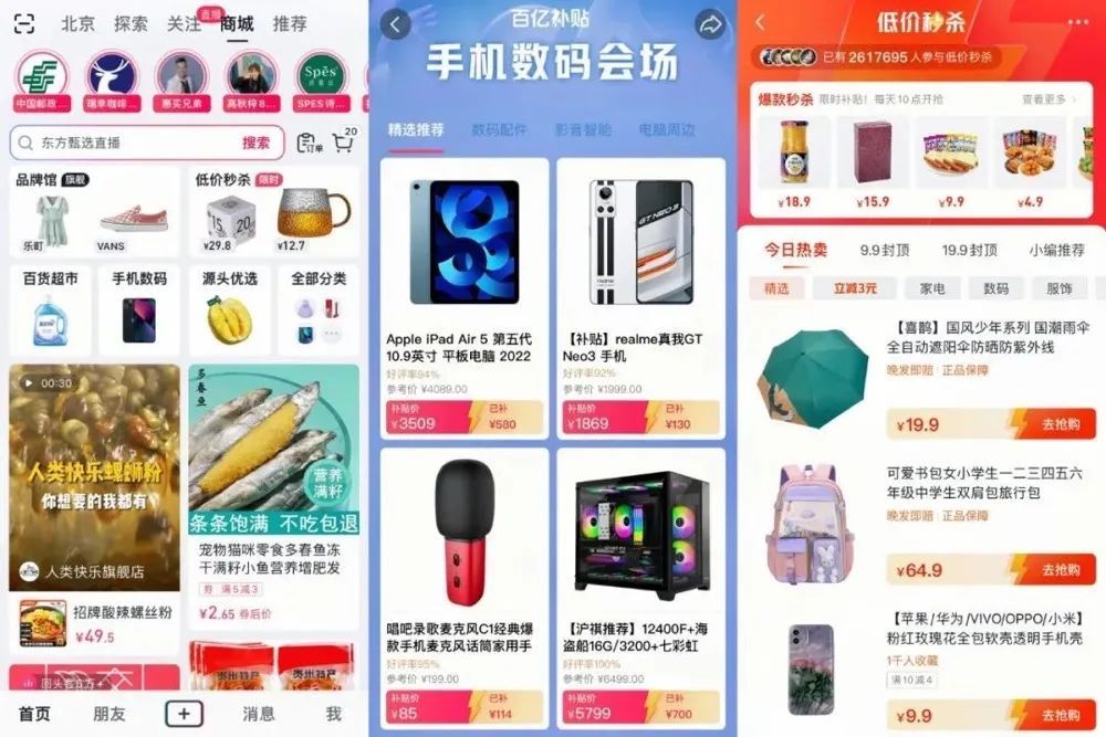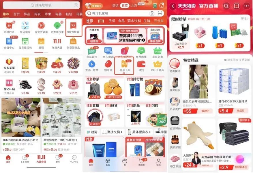 下图从左到右为拼多多的“9块9特卖”、京东的“券后9.9”、淘宝的“天天特卖”和9块9包邮: