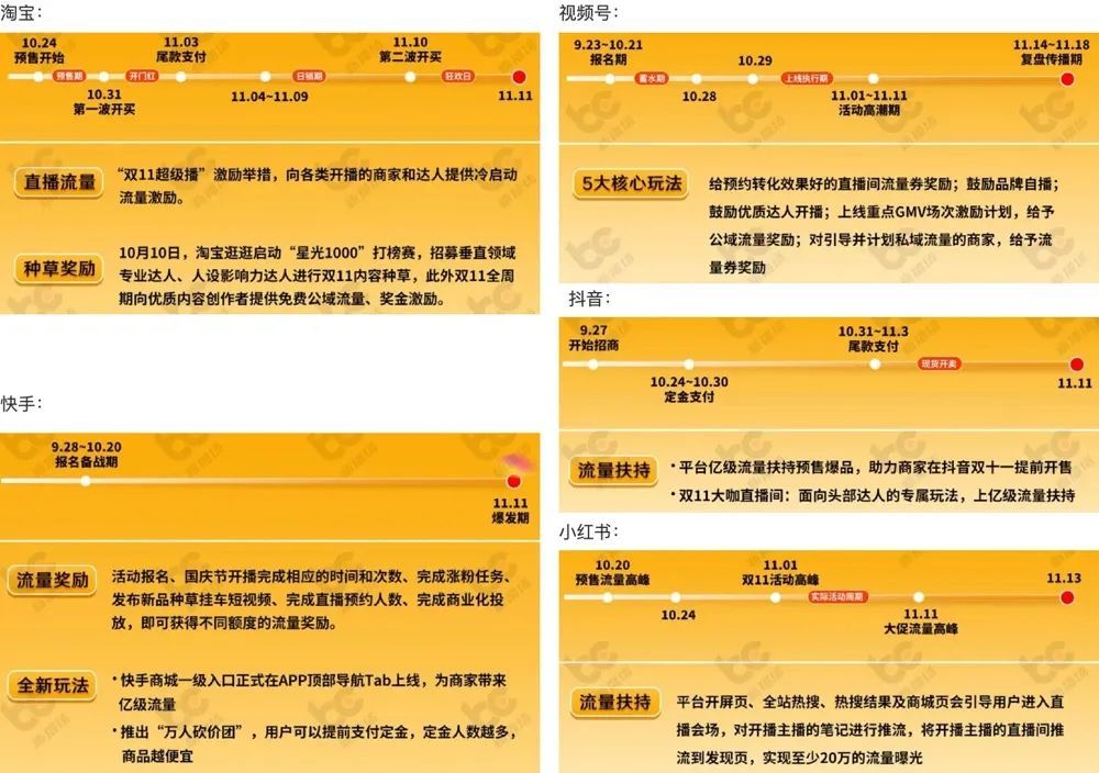 五大平台双11节奏和公布的扶持计划、玩法如图: